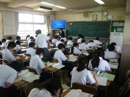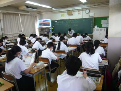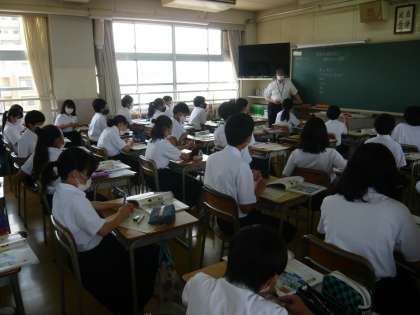 2限、1年1組は社会、地理で乾燥帯の学習をしています。1年2組は技術、生活や社会を支える「材料」について考えています。1年3組は数学、文字式の学習です。