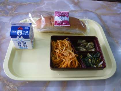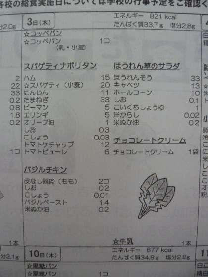 本日の献立は、コッペパン1コ、スパゲティナポリタン、バジルチキン、ほうれん草のサラダ、チョコレートクリーム、牛乳です。