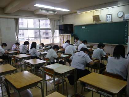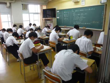 1限、3年3組は数学分割授業、どちらのクラスも確認テストに取り組んでいます。