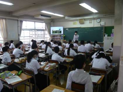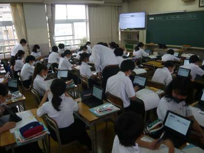 1限、1年1組は社会、熱帯雨林気候の地域について学んでいます。1年2組は英語、タブレットを使って英文を作成中です。