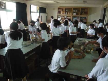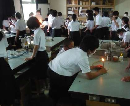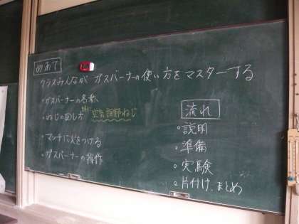 1限、1年3組は理科、理科室でバーナーの使い方の実習をしています。