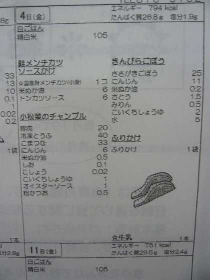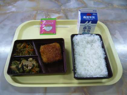 本日の献立は、白ごはん、鮭メンチカツソースかけ、小松菜のチャンプル、きんぴらごぼう、ふりかけ、牛乳です。