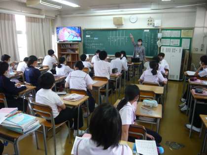 2限、3年3組は理科第二分野、生態系について学習しています。3年4組は国語、班ごとに「文豪新聞」というものをつくっていくようです。