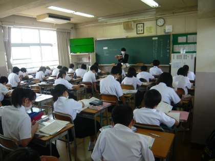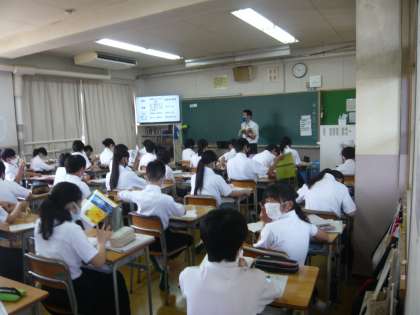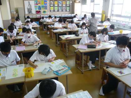 2限、1年1組は理科、石灰水の変化について調べていました。1年2組は国語、「オオカミを見る目」という教材です。絶滅したニホンオオカミの話を聞いているところでした。1年3組は美術、ユニットパターンの作品に取り組んでいます。