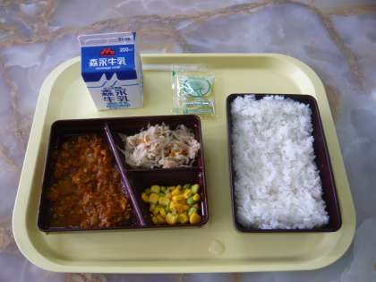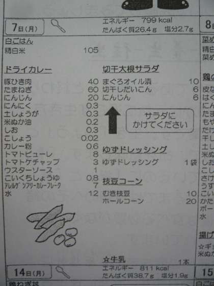 本日の献立は、白ごはん、ドライカレー、切干大根サラダ、ゆずドレッシング、枝豆コーン、牛乳です。