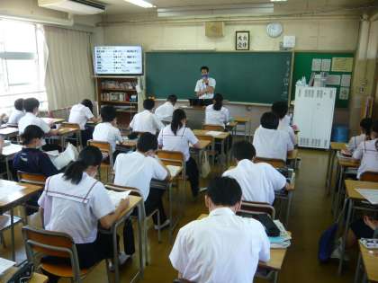 2限、3年1組は英語分割授業、受動態の否定文と疑問文を学習するようです。3年2組は理科第一分野、酸とアルカリについて学習しています。
