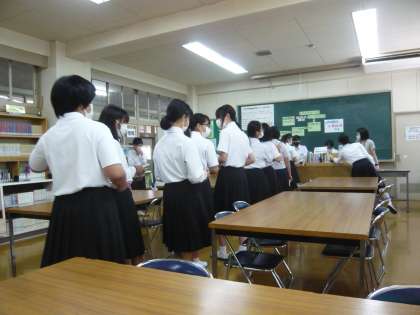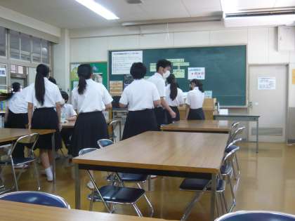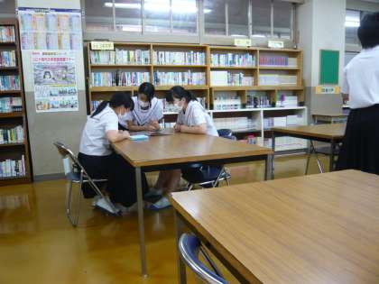 昼休み、図書室へは、たくさんの人が本を借りに、また返しにやってきます。気の合う仲間でテーブルを囲んでいる人たちもいます。なごやかな空気が流れています。