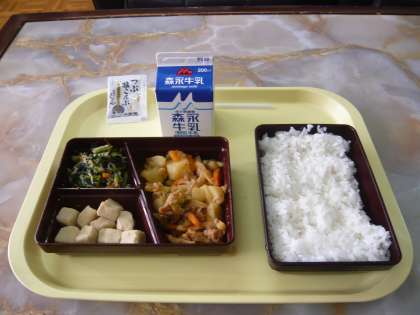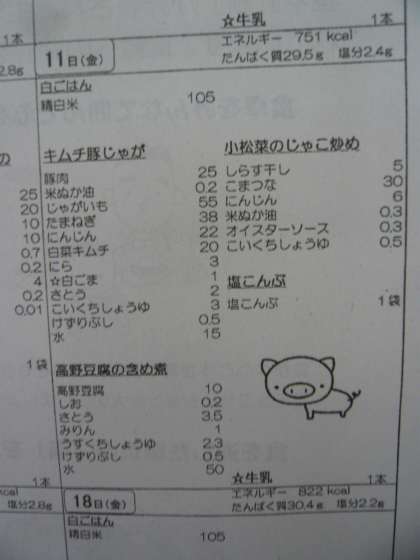 本日の献立は、白ごはん、キムチ豚じゃが、高野豆腐の含め煮、小松菜のじゃこ炒め、塩こんぶ、牛乳です。こうして書き出してみると、バランスのとれたメニューですね。