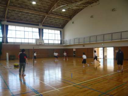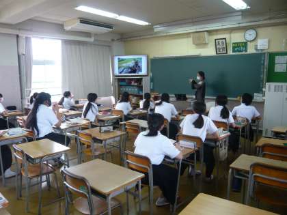 2限、2年3組女子は教室で保健、自然災害について学んでいます。男子は体育館でバレーボールの授業、2コートに分かれてゲームをしています。