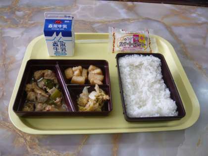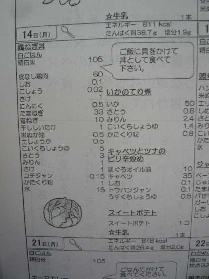 本日の献立は、鶏ねぎ丼、いかのてり煮、キャベツとツナのピリ辛炒め、スイートポテト、牛乳です。