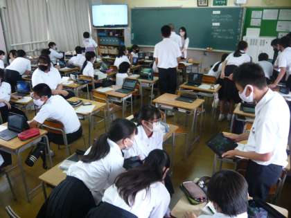 6限、2年生の総合は、先週、グラウンドで撮影した「いのちの写真」の交流です。