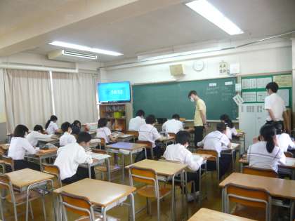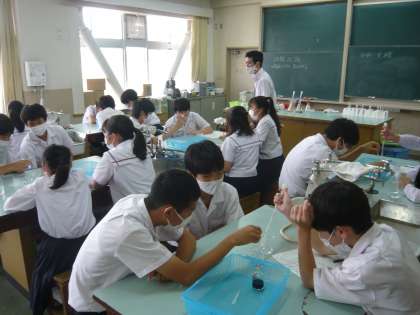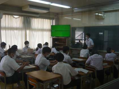 6限、3年3組は理科第一分野、理科室で「中和実験」を行っています。3年4組は英語分割授業、長文問題に取り組んでいます。