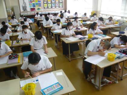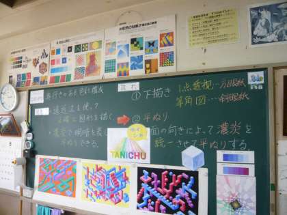 6限、2年3組は美術、「奥行きのある色彩構成」という作品づくりです。みんな一生懸命です。