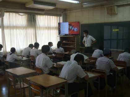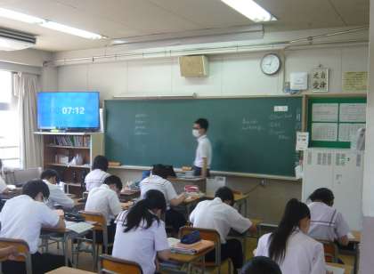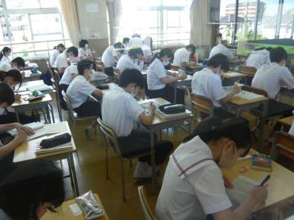 1限、3年1組は英語分割授業、長文の問題に取り組んでいます。3年2組は理科第二分野、プリントの問題を解いています。