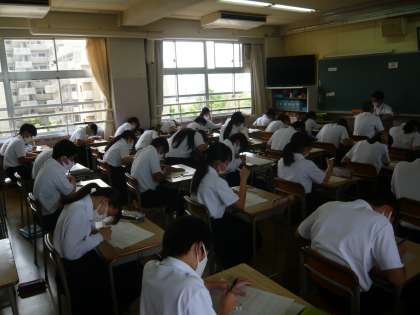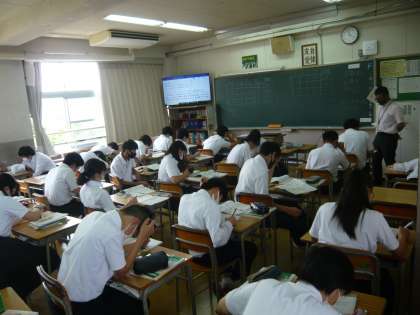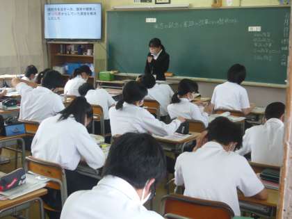 3限、2年1組は理科、「蒸散する水の量を求める」という課題に取り組んでいます。2年2組は社会、実習生の先生の授業です。江戸時代の学習をしています。2年3組は数学、単元テスト中です。