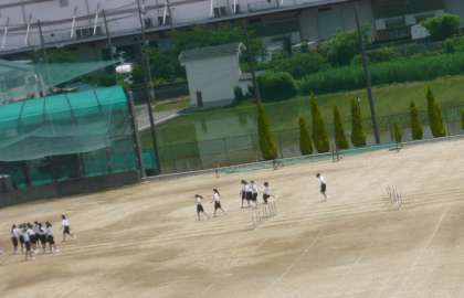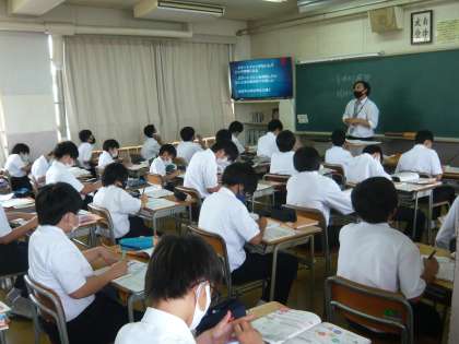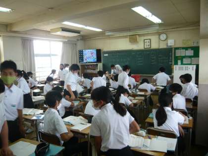 3限、1年1・2組は保健体育です。男子は教室で保健、実習生の先生の授業です。疲労について勉強しているようです。スマートフォンが題材になっていました。女子はグラウンドでハードル走、暑い中がんばっています。1年3組は英語、席を立って、ペアで会話をしていきます。