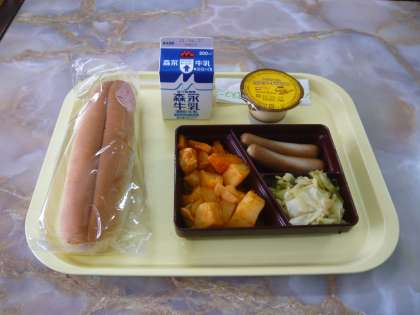 今日の給食はパン食です。縦に切れ目が入っており、ウインナーやキャベツをはさんで食べるようになっています。