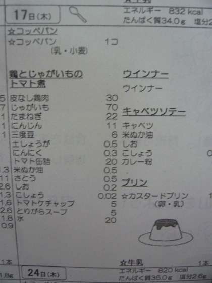 本日の献立は、コッペパン、鶏とじゃがいものトマト煮、ウインナー、キャベツソテー、プリン、牛乳です。