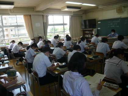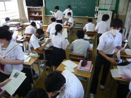 3限、3年1組は国語、「文豪新聞」を返してもらっています。なかなかの出来です。3年2組は社会、期末テストに向けて、30問の演習問題にチャレンジしています。