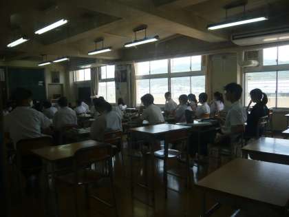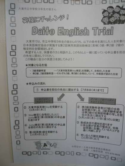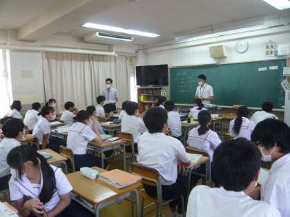3限、3年3組は音楽、短時間でリコーダーの練習をし、終わったらすぐにマスク着用です。3年4組は英語、Daito English Trialの説明を聞いていました。