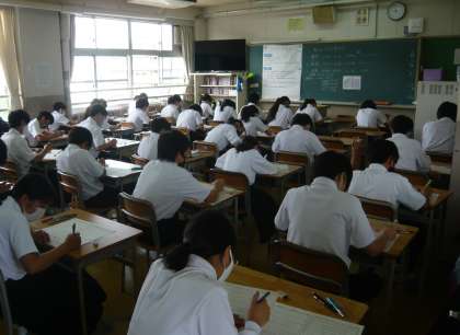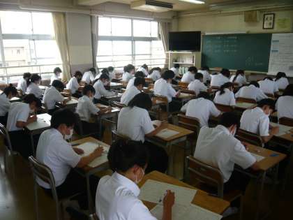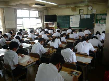 1学期末テスト最終日、1限、1年生の様子です。初めての定期テスト、最後までがんばってほしいです。
