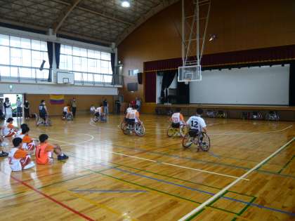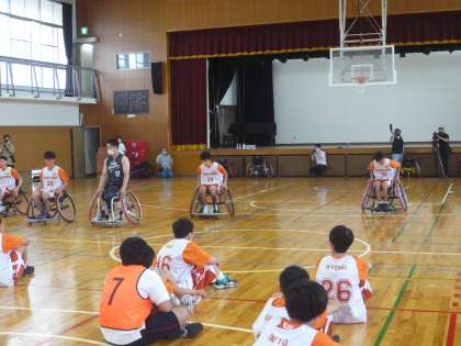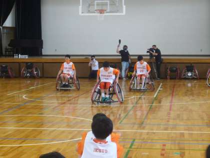 車いすバスケットボール体験会の続きです。車いすの操作を教わっています。