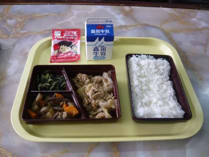 本日の献立は、白ごはん、豚肉のしょうが炒め、炒り鶏煮、ほうれん草のしらす和え、ふりかけ、牛乳です。