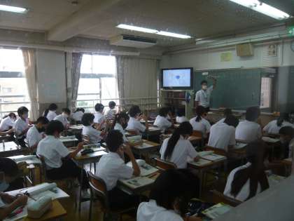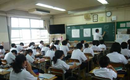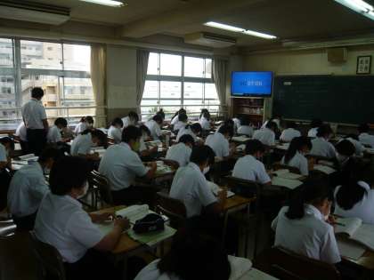 2限、1年1組は社会、世界の地形を学んでいます。1年2組は技術、構想図の書き方について学習しています。1年3組は数学、1次式の加法と減法の計算に取り組んでいます。