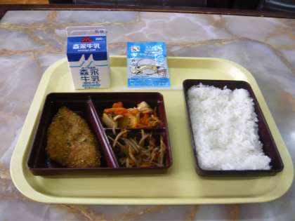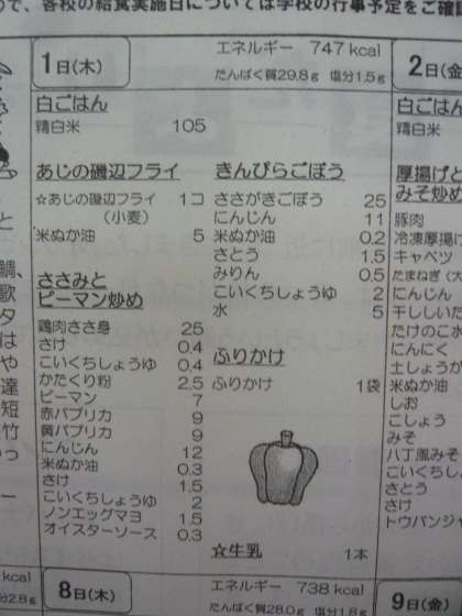 本日の献立は、白ごはん、あじの磯辺フライ、ささみとピーマン炒め、きんぴらごぼう、ふりかけ、牛乳です。