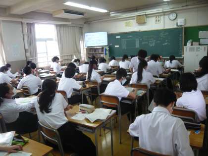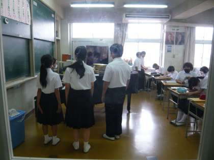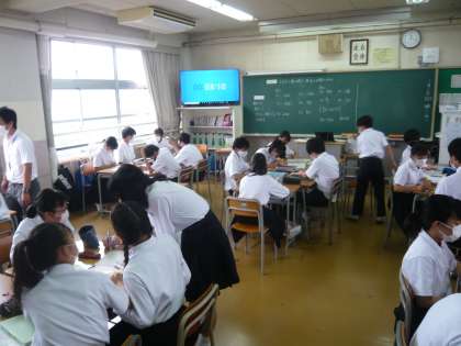 4限、1年1組は理科、質量の学習です。1年2組は数学、1次式の計算問題を班ごとにやっています。1年3組は音楽、校歌のテストです。