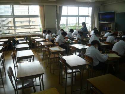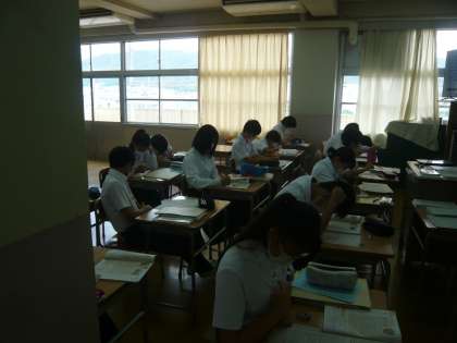 4限、2年1組は英語分割授業。小テストをしているところでした。