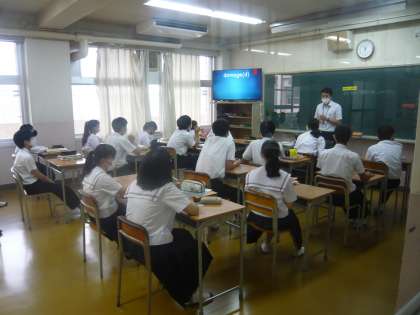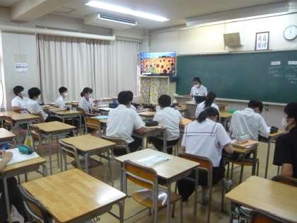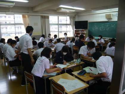 3限、3年3組は英語分割授業、教室ではスピーチテストの場面、英語教室は進出単語の練習でした。3年4組は理科、電子のことについて?これから班で話し合います。