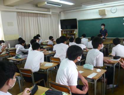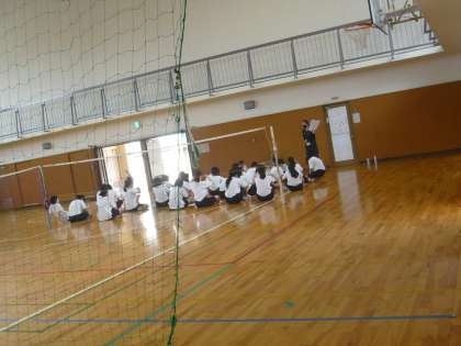 5限、3年3・4組は保健体育。男子は教室で、体育大会の種目について説明を聞いているようでした。女子は体育館。バレーボールの練習が終わって集合していました。