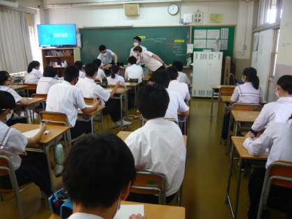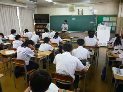 4限、3年1組は英語、今日は一斉です。この後、単語のテストのようなことに取り組んでいました。3年2組は理科、夏休みの自由研究について説明を聞いていました。
