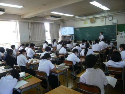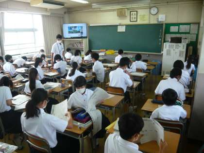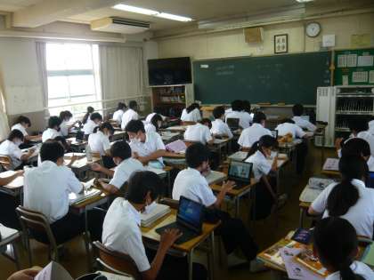 3限、1年1組は数学、クイズのような形で問題を考えています。1年2組は社会、夏休みの宿題についてです。1年3組は理科、理科も夏休みの宿題についてです。自由研究のテーマを見つけるためにタブレットで調べます。