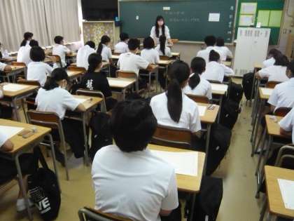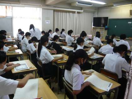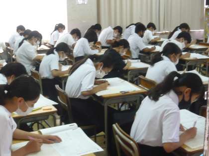 すでに受検者は集まり、諸注意を終えて、いよいよ開始です。皆さん、合格をめざしてがんばりましょう。
