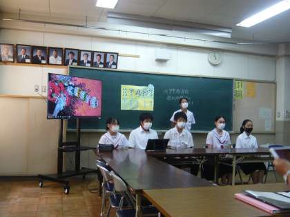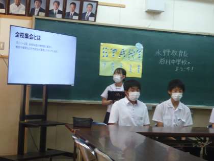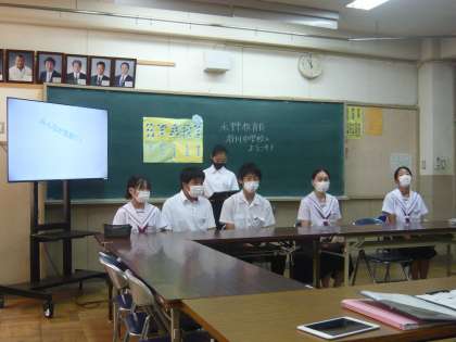 生徒会役員が作成したパワーポイントの資料を見ていただきながら、役員たちから本校生徒会活動の報告をさせていただきました。