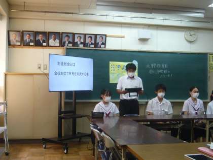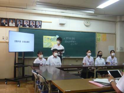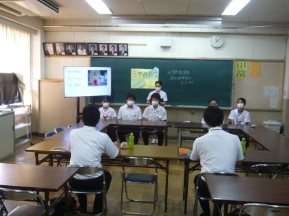 緊張しながらも、しっかりと活動を報告しています。教育長も熱心に聞いてくださっています。真ん中の写真の画面右側が教育長です。