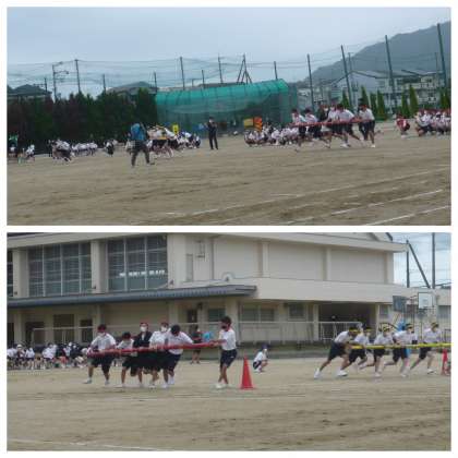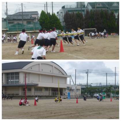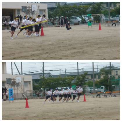 2年学年種目「台風の目」です。楽しくやるのかと思いきや、みんな必死でした。台風並みのレースでした。