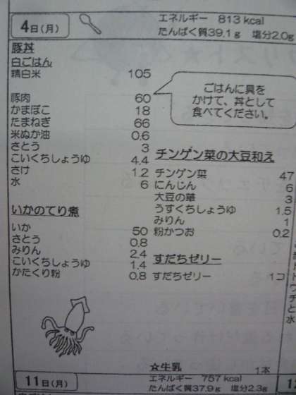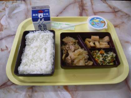 本日の給食の献立は、豚丼、白ごはん、いかのてり煮、チンゲン菜の大豆和え、すだちゼリー、牛乳です。