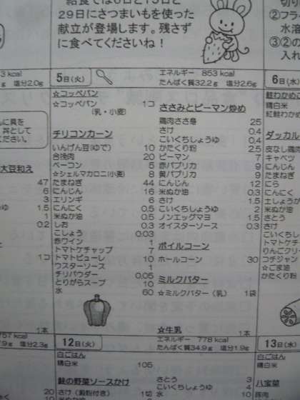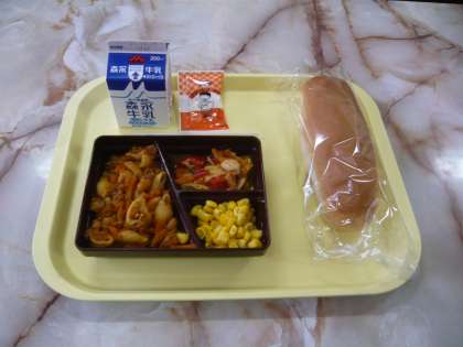 本日の給食の献立は、コッペパン、チリコンカーン、ささみとピーマン炒め、ボイルコーン、ミルクバター、牛乳です。