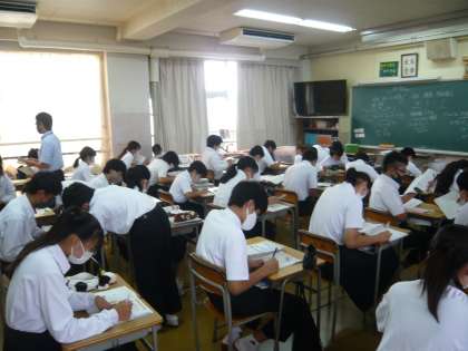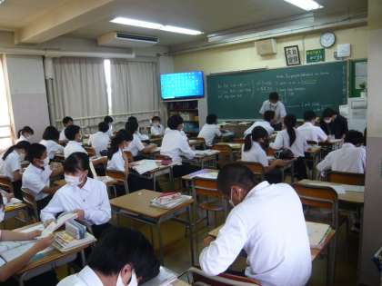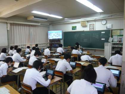 2限、2年1組は国語、タブレットを使って助詞の勉強をしていました。2年2組は理科、化学反応式の課題に取り組んでいます。2年3組は英語、スピーチの内容を考えています。
