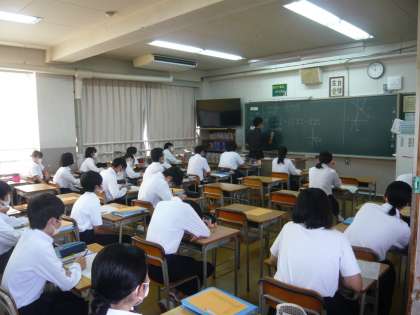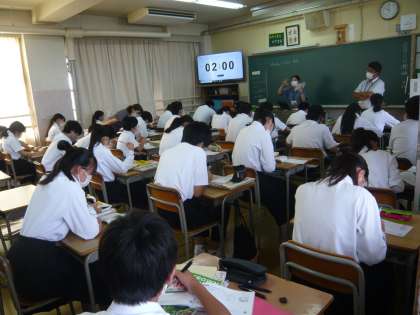 2限、2年1組は数学、連立方程式をグラフで表すような学習をしていました。2年2組は英語、「読みトレ」のワークで読みの練習をしていました。