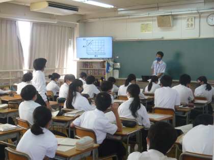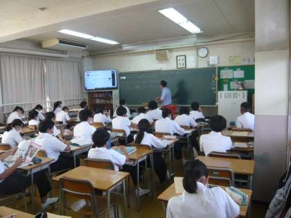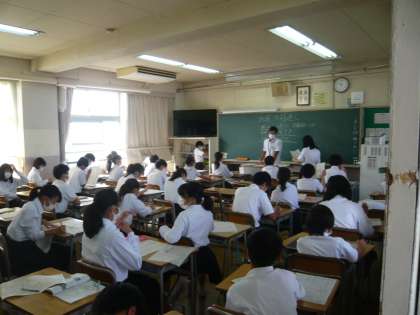 2限、1年1組は理科、光の屈折について学んでいます。1年2組は社会、テスト返しです。1年3組は英語、「どちら?」について学習しています。