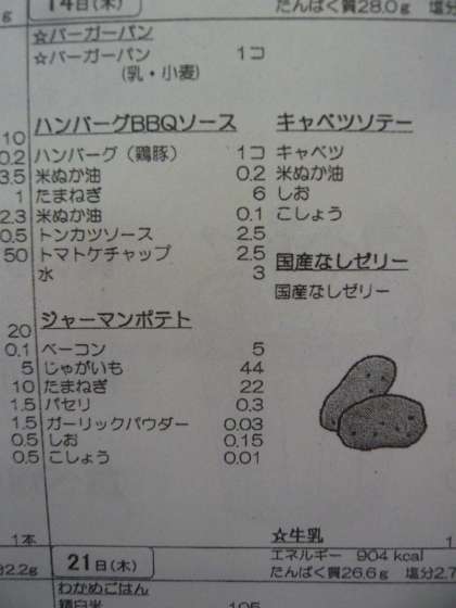 本日の給食の献立は、バーガーパン、ハンバーグBBQソース、ジャーマンポテト、キャベツソテー、国産なしゼリー、牛乳です。