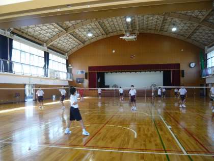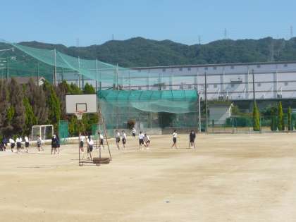 4限、2年1・2組は体育。男子は体育館でバドミントン、女子はグラウンドでティーボールですが、女子は終わりの方に行ったので、片付けに入っていました。