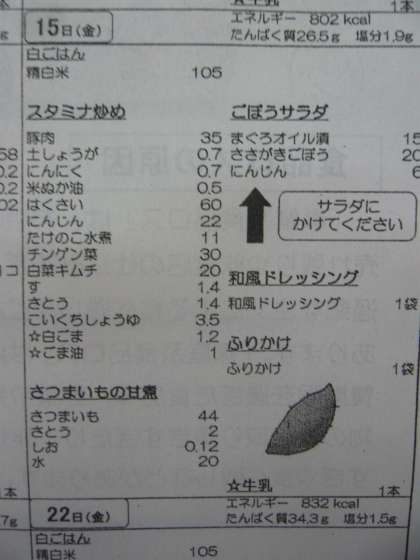 本日の給食の献立は、白ごはん、スタミナ炒め、さつまいもの甘煮、ごぼうサラダ、和風ドレッシング、ふりかけ、牛乳です。