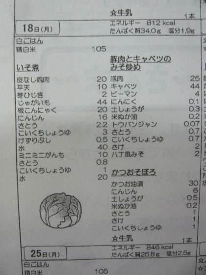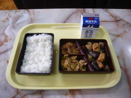 本日の給食の献立は、白ごはん、いそ煮、豚肉とキャベツのみそ炒め、かつおそぼろ、牛乳でした。