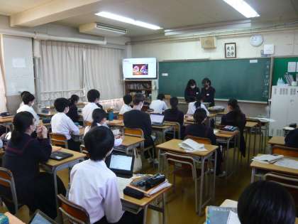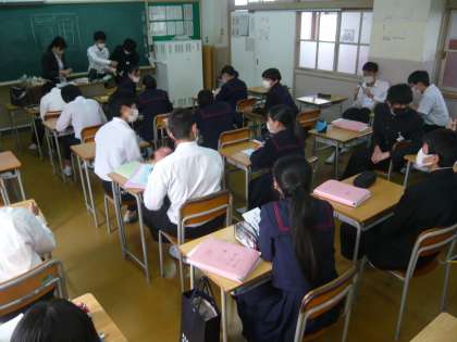 4限、3年1組は国語、俳句の展示作品の清書をしています。3年2組は英語、スピーチの発表をしていました。