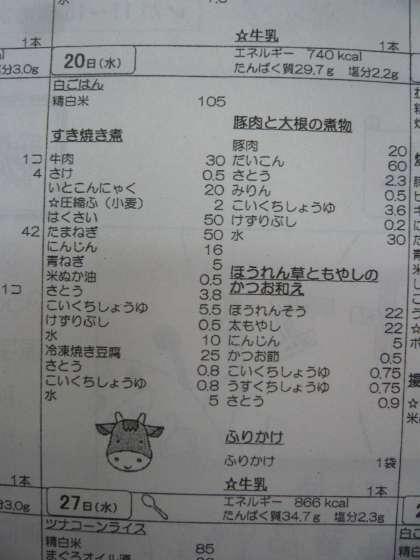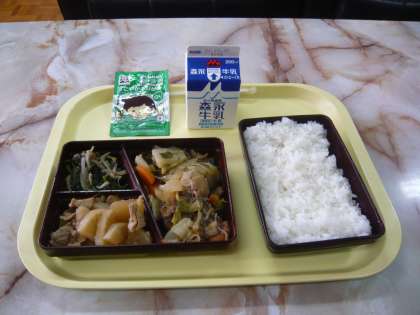 本日の給食の献立は、白ごはん、すき焼き煮、豚肉と大根の煮物、ほうれん草ともやしのかつお和え、ふりかけ、牛乳です。